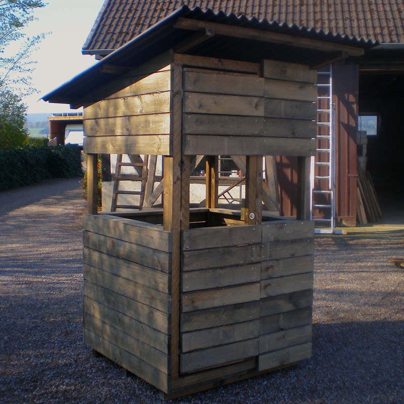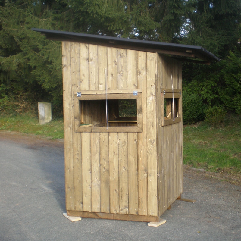 Bei dieser Kanzel werden alle Fenster als Bretterlukengefertigt. Die gesamte geschlossene Kanzel, einschließlichGerüst und Leiter, wird aus Fichtenholz im Bausatzprinzip gefertigt und ist gestrichen.