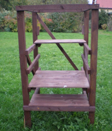 Das Geländer hat eine Brüstungshöhe von ca. 1,00 m und umrandet das Podest. Das gesamte Gerüst wird aus gestrichenem Fichtenholz im Bausatzprinzip gefertigt.