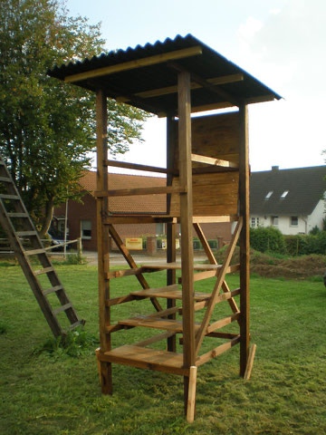 Die Kanzel wird aus 21 mm starkem Rauspund gefertigt und ist somit wind- und wasserdicht. Die Brüstungshöhe der Fenster (Gewehrauflage) beträgt ca. 1,00 m.