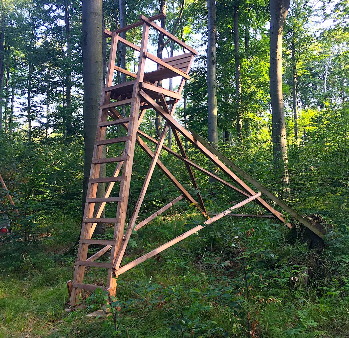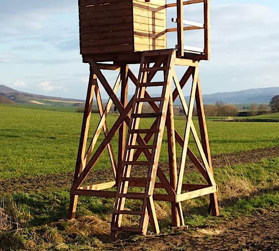 Das Kanzelgerüst mit Podest und Leiter hat eine Höhe von 3,00 m. Dies bedeutet man hat eine Sitzhöhe von etwa 3,50 m.