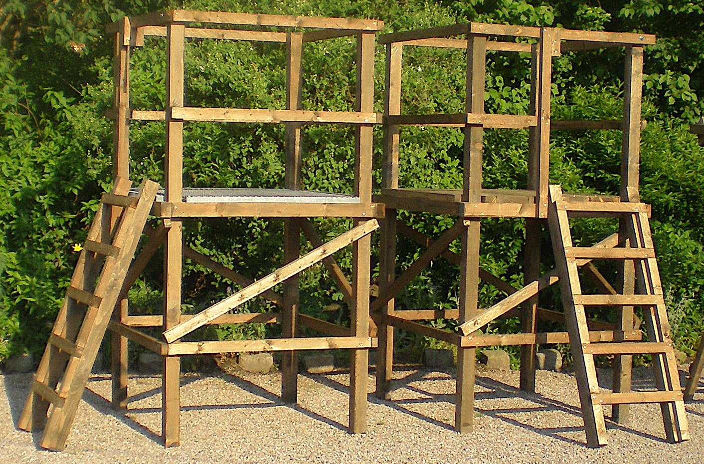 Die oberen Querholme, die zur Auflage der Kanzel dienen, werden ebenfalls aus 10 cm x 10 cm Fichtenkanthölzern gefertigt. Das gesamte Gerüst wird aus gestrichenem Fichtenholz im Bausatzprinzip gefertigt.
