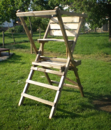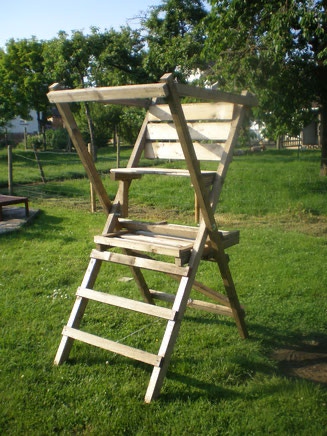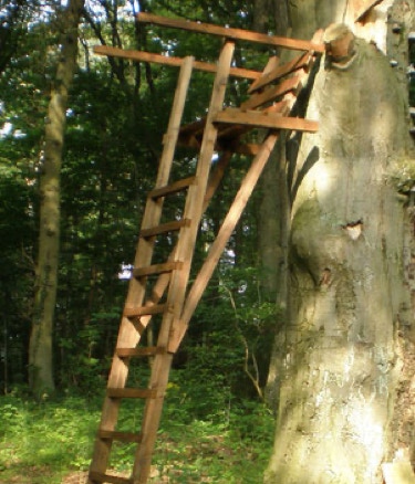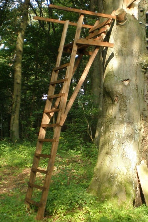 Die Leiter hat eine Gesamthöhe von 4,00 m und ist 0,60 m breit. Sie ist zum Anlehnen an Bäumen gedacht mit einer Sitzhöhe von ca. 3,50 m.