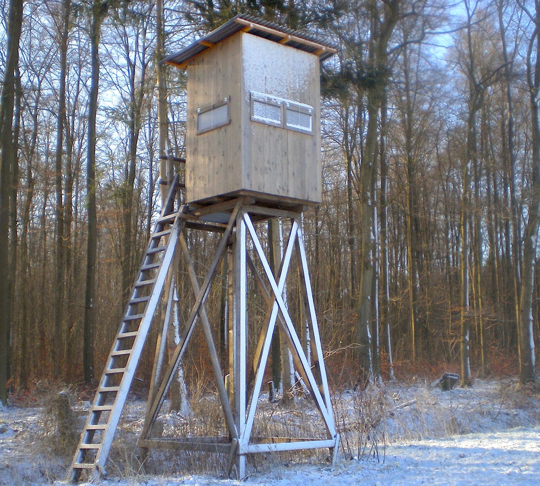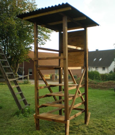 Die Kanzel wird aus 21 mm starkem Rauspund gefertigt und ist somit wind- und wasserdicht. Die Brüstungshöhe der Fenster (Gewehrauflage) beträgt ca. 1,00 m.