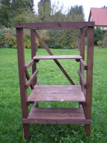 Das Geländer hat eine Brüstungshöhe von ca. 1,00 m und umrandet das Podest. Das gesamte Gerüst wird aus gestrichenem Fichtenholz im Bausatzprinzip gefertigt.