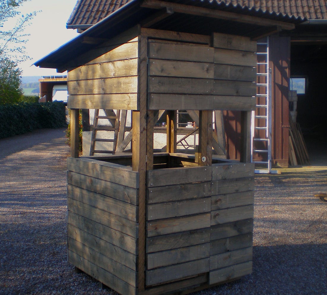 Die Kanzel wird aus 24 mm starken, sägerauen Brettern gefertigt, die mit einem Abstand von ca. 1 cm angeschraubt werden, hiermit wird ein besseres Abtrocknen gewährleistet.
