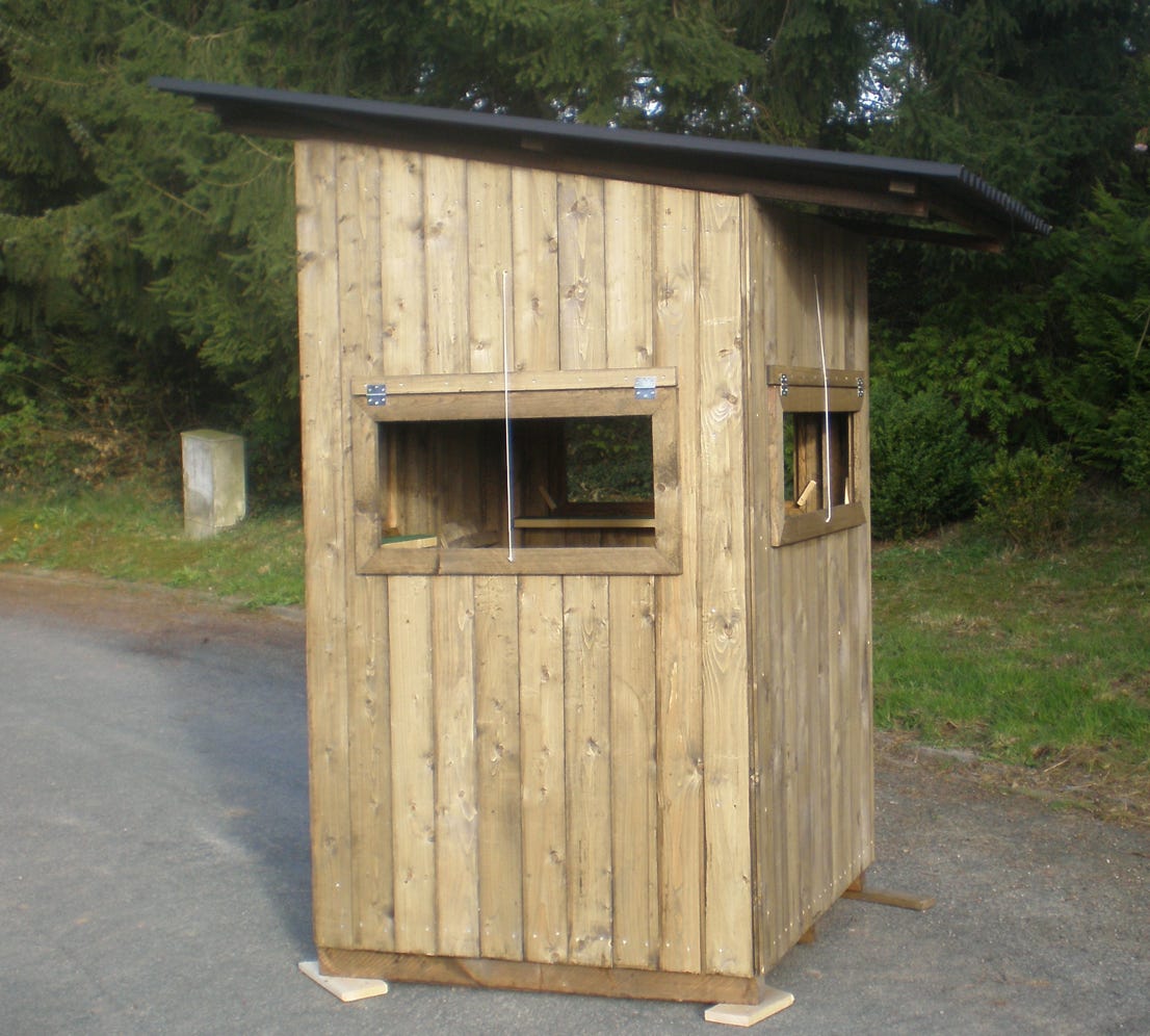 Bei dieser Kanzel werden alle Fenster als Bretterlukengefertigt. Die gesamte geschlossene Kanzel, einschließlichGerüst und Leiter, wird aus Fichtenholz im Bausatzprinzip gefertigt und ist gestrichen.